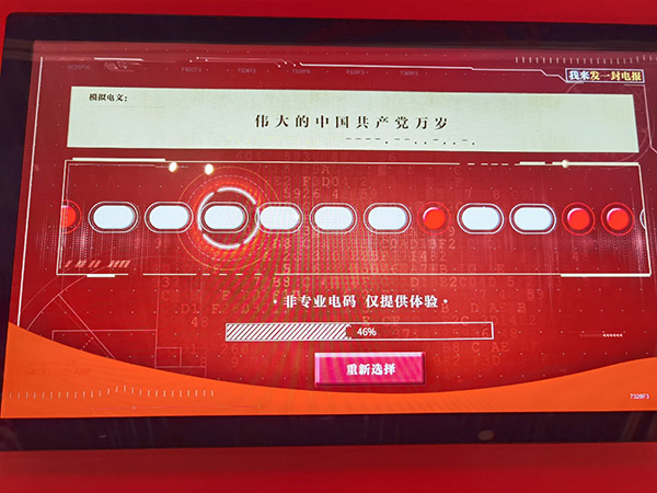 “滴答滴答”,就是党中央和毛主席的声音,全党全军都无条件执行。在展览现场,还设有“电报朗读”“发报互动体验”等互动展项。观众可以通过扫描二维码听到有声电文,还可以通过模拟摩尔斯电码的形式,发出“伟大的中国共产党万岁”“不忘初心、牢记使命”等电文,亲身感受那令人心潮澎湃、思绪万千的“滴答滴答”声。